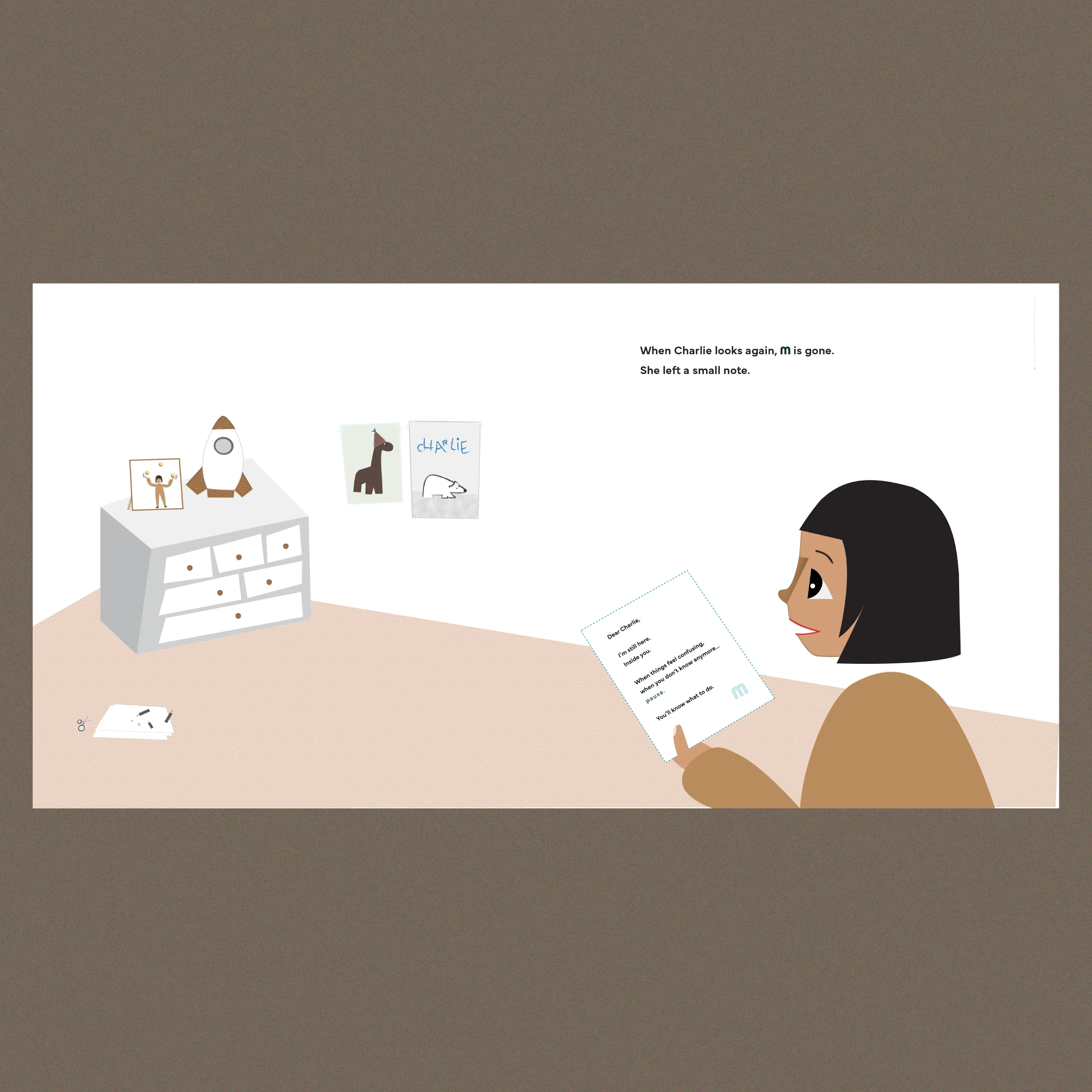 M is the invisible part of Charlie who knows what to do when things feel hard. A minimalist picture book inviting children to pause, listen inside, and find their way.